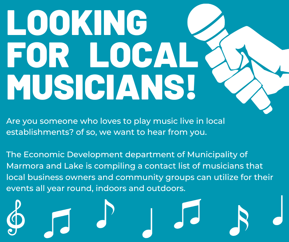 Latest News Tammy May 2025-07-08 Tammy May 2025-07-08 Looking for Local Musicians Read More Tammy May 2025-06-30 Tammy May 2025-06-30 Municipality of Marmora and Lake Receives $10,000 Hydro One Recovery Grant Read More Tammy May 2025-06-18 Tammy May 2025-06-18 Support Local Saturdays are Back! Read More Tammy May 2025-06-13 Tammy May 2025-06-13 Marmora Mine Read More Tammy May 2025-05-27 Tammy May 2025-05-27 Marmora & Lake Fire Dept. Open House Read More Tammy May 2025-05-22 Tammy May 2025-05-22 Marmora Fair Read More Tammy May 2025-05-22 Tammy May 2025-05-22 Music in the Park Read More Tammy May 2025-05-22 Tammy May 2025-05-22 Canada Day Parade Read More Tammy May 2025-05-22 Tammy May 2025-05-22 Marmora Crowe Valley Lions Country Music Jamboree Read More Tammy May 2025-05-22 Tammy May 2025-05-22 Canadian Combo BBQ & Food Truck Fest Read More Tammy May 2025-02-05 Tammy May 2025-02-05 2025 Spring/Summer Employment Opportunities with the Municipality of Marmora and Lake! Read More Tammy May 2024-12-03 Tammy May 2024-12-03 Canada Summer Jobs 2025 - Applications for employers are now open! Read More Tammy May 2024-10-08 Tammy May 2024-10-08 Hastings County Fall Social Event in Marmora and Lake! Read More Tammy May 2024-09-17 Tammy May 2024-09-17 Former Maple Leaf Greg Terrion to be inducted to the Belleville Sports Hall of Fame! Read More Tammy May 2024-08-06 Tammy May 2024-08-06 Economic Development Advisory Committee Meeting - Location and Date Changed for August Read More Tammy May 2024-07-22 Tammy May 2024-07-22 Legion Park Public Beach Temporary Closure! Read More Tammy May 2024-05-29 Tammy May 2024-05-29 June 4th Regular Council & Planning Meetings Cancelled! Read More Tammy May 2024-05-24 Tammy May 2024-05-24 Nathan Runion’s Memorial in Memorial Park is Open! Read More Tammy May 2024-05-23 Tammy May 2024-05-23 Mayor’s Report for May 21, 2024 Read More Tammy May 2024-05-23 Tammy May 2024-05-23 Welcome Jess Downer, Economic Development Assistant! Read More Older Posts Subscribe to Our News Channel Sign up with your email address to receive news and updates. Email Address Sign Up We respect your privacy. Thank you!